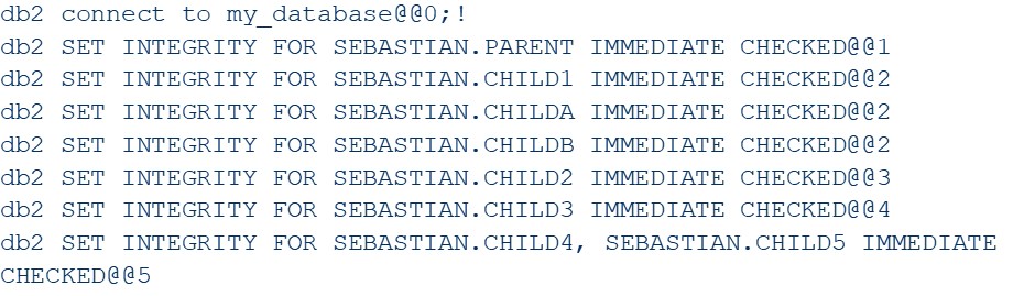 For a small number of tables you could run the SET INTEGRITY statements in whatever order you want, regenerating the statements after each iteration for all tables still in the check pending state and re-execute the statements till there are no check pending tables anymore. But if you want to have the SET INTEGRITY statements in the right order to begin with, you must use a little bit of cleverness.